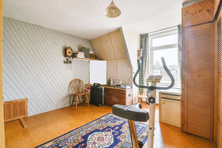 Lovely room with exercise machine and wooden cabinet