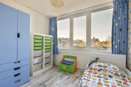 Interior of white room with children bed and blue wardope near window in daylight