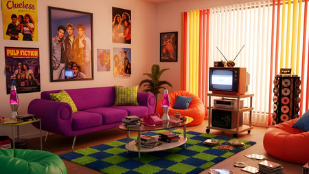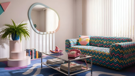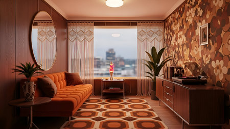 This image depicts a lively and colorful living room with a retro aesthetic. The room features a vibrant, patterned sofa, striped walls in shades of purple and green, and a sunburst mirror above a yellow console table. The space is adorned with various retro posters and framed art, adding to the eclectic charm. A potted palm plant adds a touch of nature, while a checkered floor completes the vintage look.