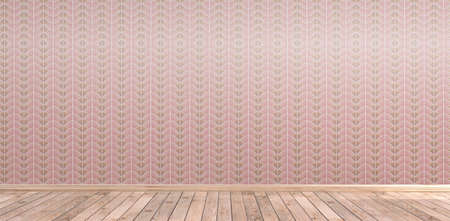 Art deco home interior background, empty room, red pattern wallpaper and wooden floor, old fashioned wall template, 3d illustration