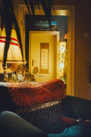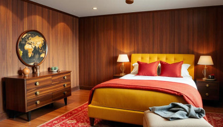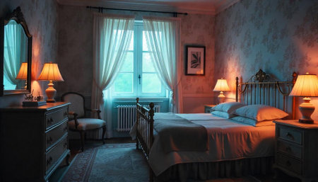 Vintage bedroom illuminated with warm lighting and classic furniture