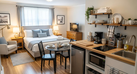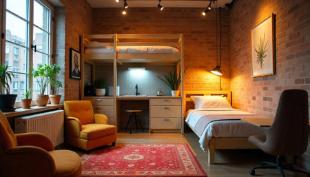 Cozy studio apartment interior with lofted bed and workspace