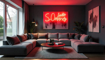Contemporary living room with neon art and sectional sofa