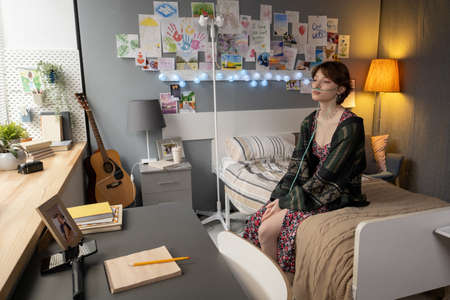 Teenage girl in homewear sitting on bed in hospital ward while taking course of medical treatment in modern clinics