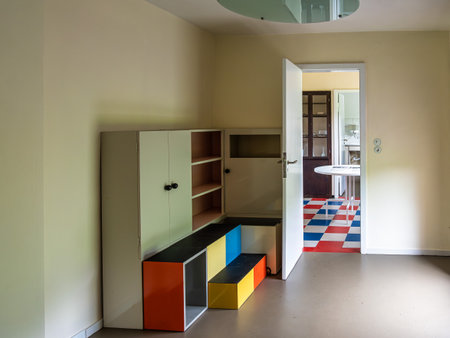 Weimar, Germany - May 12, 2023: Interior of the Haus am Horn building in Weimar in Germany with multi-color geometrical cubes, cupboard and doors.