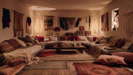 This image depicts a cozy and vibrant living room with a strong retro aesthetic. The room features a mustard yellow sofa adorned with colorful throw pillows. A wooden coffee table sits in front of the sofa, holding a few decorative items. The walls are decorated with an array of framed art and a macrame hanging. A tall floor lamp with a yellow shade stands beside the sofa, adding to the warm lighting. The room is further embellished with potted plants, a woven rug, and curtains that complement the overall vintage theme.