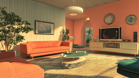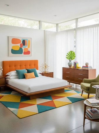 This image showcases a lively and colorful mid-century modern living room. The room features a variety of furniture pieces including armchairs and a coffee table, all arranged around a central rug. The walls are adorned with an array of colorful artwork, and a large mirror is mounted above a wooden sideboard. The space is further brightened by natural light streaming in from a large window and accented with potted plants and decorative vases.