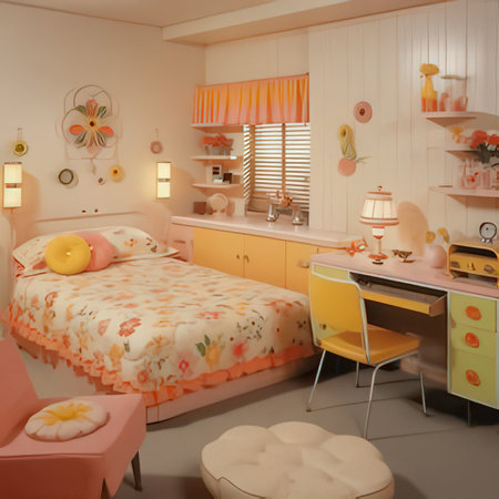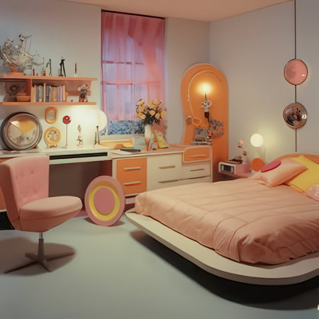 3d render of children's room with pink and orange furniture.
