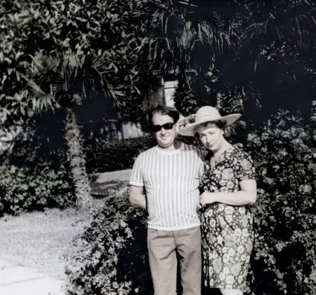 Vintage portrait of a happy married couple in a summer garden. The woman wears a straw hat. The man wears dark glasses. Retro photo, 1971.
