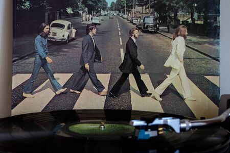 Naples, Italy 20 August 2019. Turntable with the Abbey Road vinyl of the Beatles in the background.