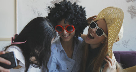 Three girls friends make selfie. Young women grimasing and posing funny at home