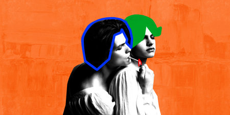 Contemporary art collage. Two men posing together and their hairs outlined, highlighted with blue and green against vibrant textured background. Concept of classic and modernity fusion, aesthetic. Ad