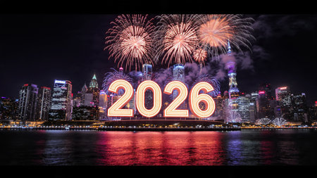 The year 2026 written in glowing blue neon light painting against a city skyline. Clear details a...