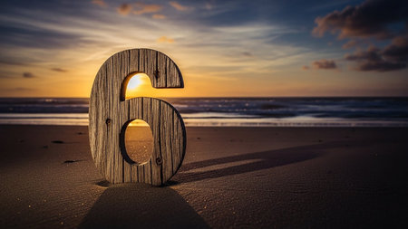 A wooden number six stands on a sandy beach with ocean waves and a sunset in the background.