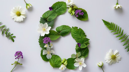 An artistic composition featuring the number six created with vibrant green leaves and delicate flowers, highlighting nature's beauty and thoughtful design.