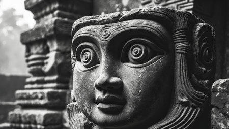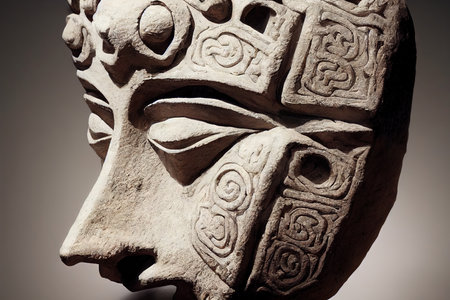 AI Generated. Intricate stone carving featuring spiral eyes symbolizing wisdom and the universe gazing at observers in a historical setting