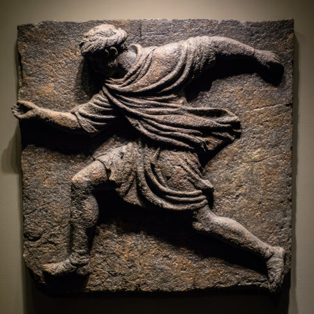 An ancient relief sculpture depicts a running figure carved from stone. The artwork presents a stylized form with flowing drapery and dynamic motion. The monochromatic palette and textured surface suggest an archaeological artifact, suitable for historical documentation and creative applications. It evokes classical antiquity and timeless themes.