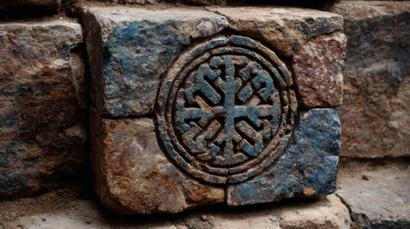 A detailed close-up of a weathered stone block with an intricate carved design. This unique artifact was uncovered at a historical site during an archaeological dig focused on ancient cultures.