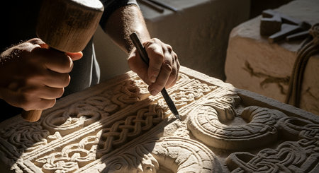 A close-up of a stonemason's hands carving an intricate Celtic knot pattern into a block of stone. The artisan is using a chisel and a wooden mallet, with strong light illuminating the dust and texture of the work. This image represents traditional craftsmanship, skill, and artistry.
