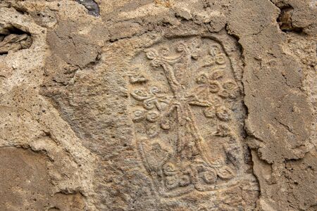 Khachkar, embedded in the wall of the church. Religious background.