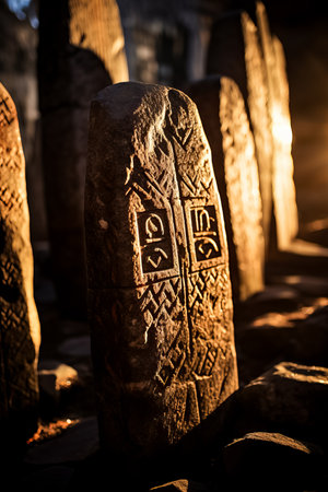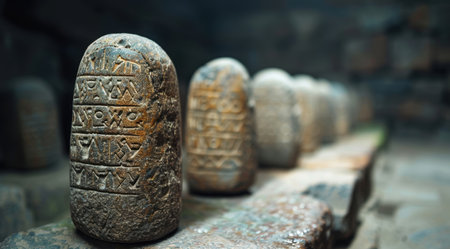 Close-up of ancient rune stones casting shadows under soft lighting