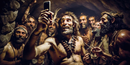 Group of prehistoric human or neanderthal taking selfie picture with mobile phone in funny emotion. superlative generative AI image.
