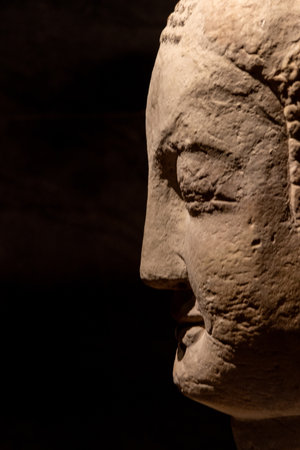Close up of buddha face with dark background at Dazu Stone Carving Museum in Chongqing, China. The museum focuses on the collection, preservation, and research of the Dazu Rock Carvings