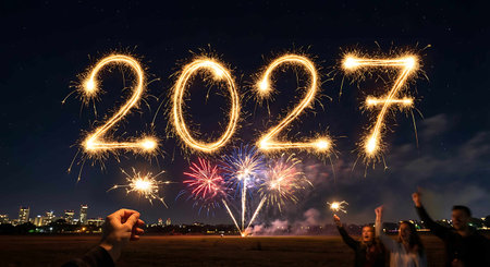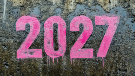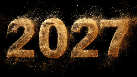 Stunning representation of the year 2027 crafted from golden dust on a dark backdrop, perfect for New Year themes, celebrations, and creative projects.