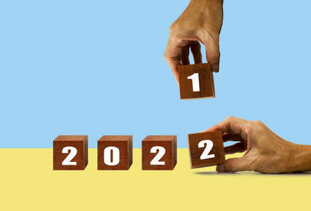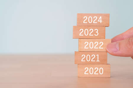 Sticky notes with figures denoting years 2019-2022 on color wooden background