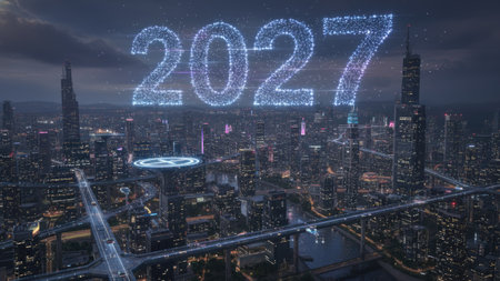 An aerial view presents a modern metropolis with illuminated skyscrapers. The image prominently features the year 2027 in a glowing, futuristic font. The composition employs cool tones and nighttime lighting, suggesting a forward-thinking technological environment suitable for various commercial projects and editorial needs.
