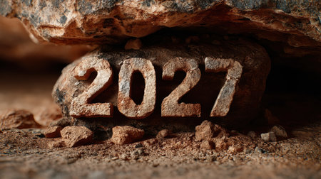 Close-up of a stone featuring a carved 2027 against a backdrop of rustic earth tones. Ideal for artistic, inspirational, and creative projects.