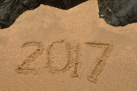 Inscription on wet sand Summer 2016. Concept photo of summer vacation.