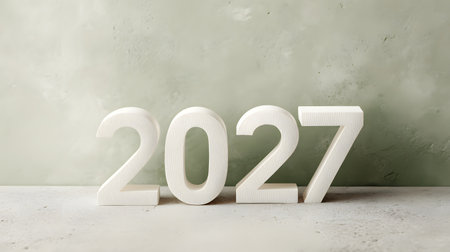 Happy New Year 2027. Golden numbers on a light glitter background. concrete background with copy space. 2027 numbers on a white marble background