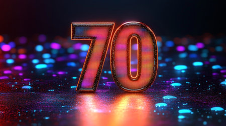 Big Three-Dimensional Orange Glowing Number Seventy, 70, in Futuristic Cyberpunk Aesthetic.