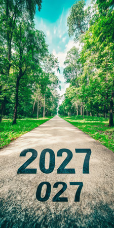 Path to the Future 2027 Painted on Serene Forest Road Symbolizing New Beginnings and Hope