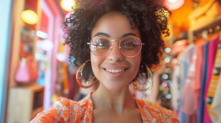 A smiling woman in an orange dress, wearing round glasses, poses for a selfie in a brightly lit store.
