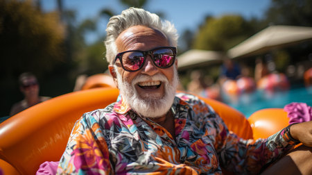 Man in his 70s with a colourful inflatable pool float against a colourful backyard pool.