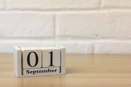 September 1. Wooden calendar on a white brick background with an empty space. The concept of Back to school