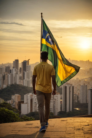 A captivating silhouette of a person proudly holding a Brazilian flag stands against a stunning sunset. The sky is filled with colorful clouds, capturing a moment of pride and tranquility in nature.