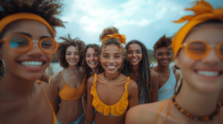 A multiracial group of joyful young friends enjoying a sunny summer day outdoors, wearing vibrant yellow and posing with genuine smiles.