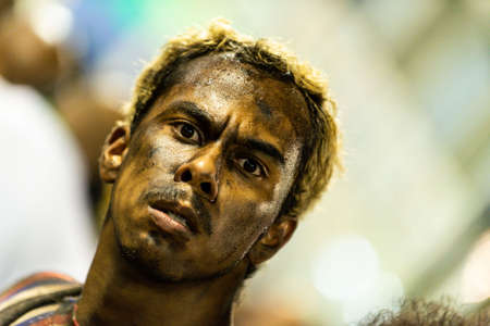 Close-up of a determined rescue medic with muddy face during an emergency operation in a forest.