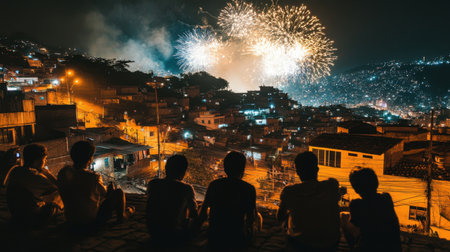 A group of friends watches spectacular fireworks illuminating a lively city skyline during a festive celebration at night.
