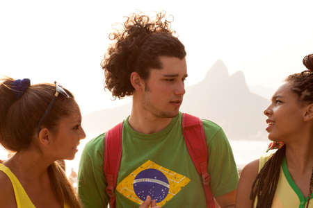 Three young adult friends chatting on Ipanema beach, Rio De Janeiro, Brazil