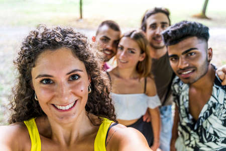 Group of friends having fun together in the nature. Multiethnic group of young people having fun outdoors.