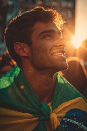 A Brazilian fan smiles warmly with a sunlit flag draped behind, capturing cinematic optimism and tropical light tones. The image exudes a sense of joy and national pride.