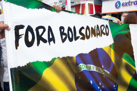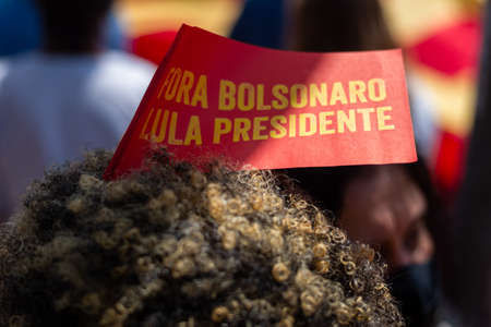 Salvador, Bahia, Brazil - July 24, 2021: People protest against the government of President Jair Bolsonaro in the city of Salvador. They use banners, posters, stickers and masks with slogans.