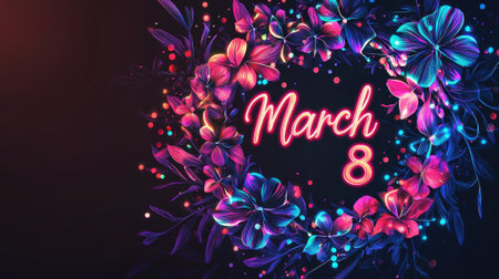 A vibrant design featuring a wreath of flowers illuminated with neon colors, highlighting the date March 8, symbolizing International Women's Day.
