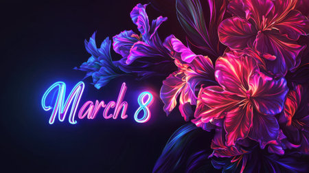 Bright neon lights highlight the date March 8 surrounded by colorful flowers, creating a festive and uplifting atmosphere for International Women's Day celebrations.