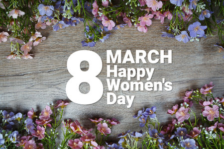 8 March Happy Womens Day text message with flowers decoration on wooden background