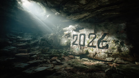 A captivating scene inside a cave displaying the year 2026 carved into a stone wall, illuminated by soft sunlight creating a mystical atmosphere.